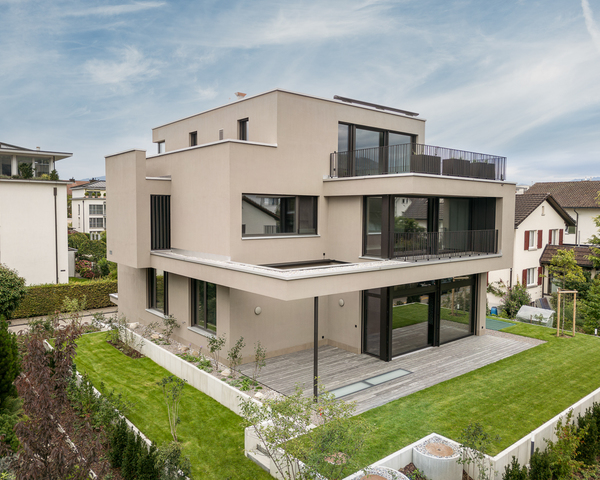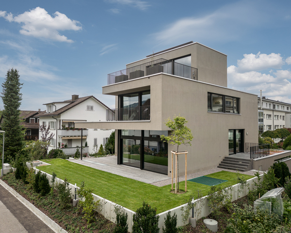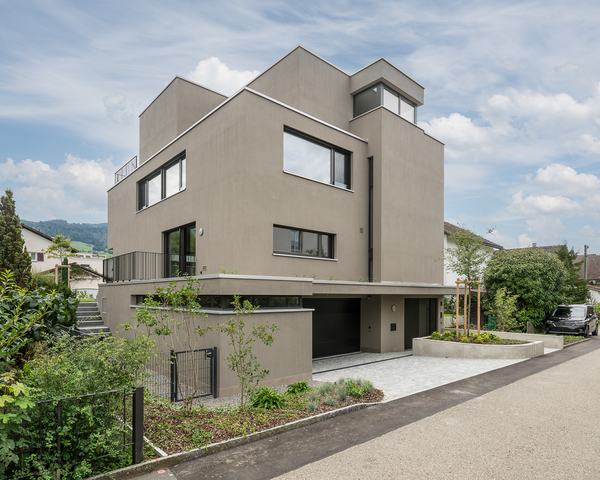 Das Gebäude steht in einem kleinmassstäblichen Quartier. Das Haus öffnet sich zum im Süden gelegenen Garten mit dem überhohen verglasten Wohnzimmer. Die Architektur versucht über die klassische Box hinaus mit der Umgebung zu interagieren. So gibt der Bügel im Süden der Terrasse Halt und fasst den Aussenraum. Auf der Ankunftsseite im Norden ist die Fassade verschlossener und muraler. Die Fassade zeigt sich in seiner dunklen Farbe körperhaft und verspielt und bringt horizontale und vertikale Elemente in eine Balance. Der Besucher wird hier von einem grosszügigen Vordach empfangen. Das Haus steht selbstbewusst und setzt ein Zeichen in einem Quartier, das sich im Wandel befindet.